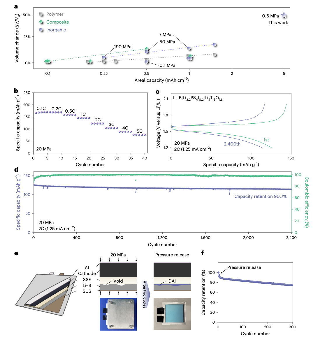 实验室采用“零应变”LTO(钛酸锂)正极的全电池,在仅0.6MPa外压下完成了2400次循环,容量保持率仍高达90.7%。