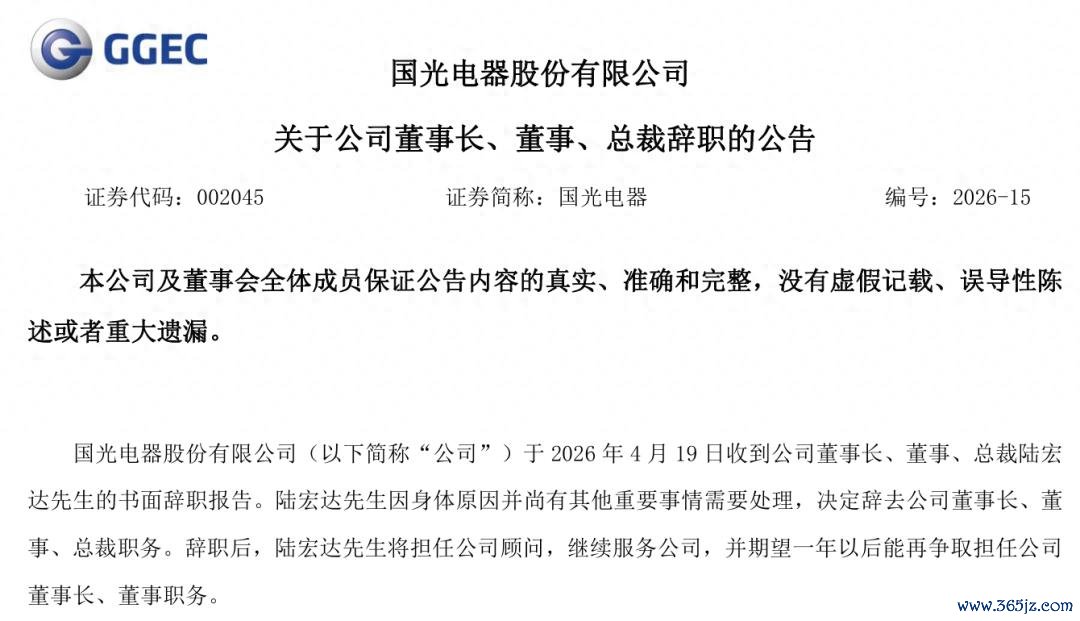 4月20日早间,国光电器公告,于2026年4月19日收到公司董事长、董事、总裁陆宏达的书面辞职报告。
